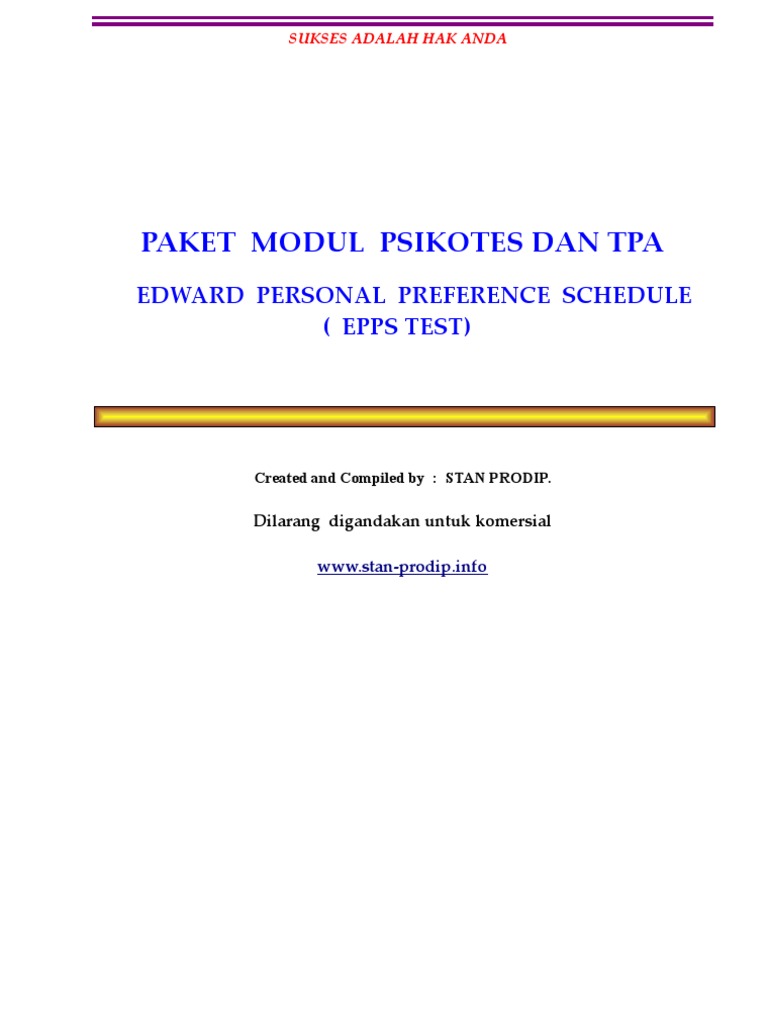Admin blog contoh soal terbaru 24 january 2022 juga mengumpulkan gambar gambar lainnya terkait contoh tes epps dan jawabannya pdf dibawah ini. Jumlah soal dalam tes ini terdiri dari 225 pasangan pernyataan pernyataan. Tes ini disusun oleh edward berdasarkan teori h. Saya adalah pemimpin yang baik. Tes ini digunakan untuk mengetahui seberapa besar motivasi, kebutuhan, dan motif seseorang.