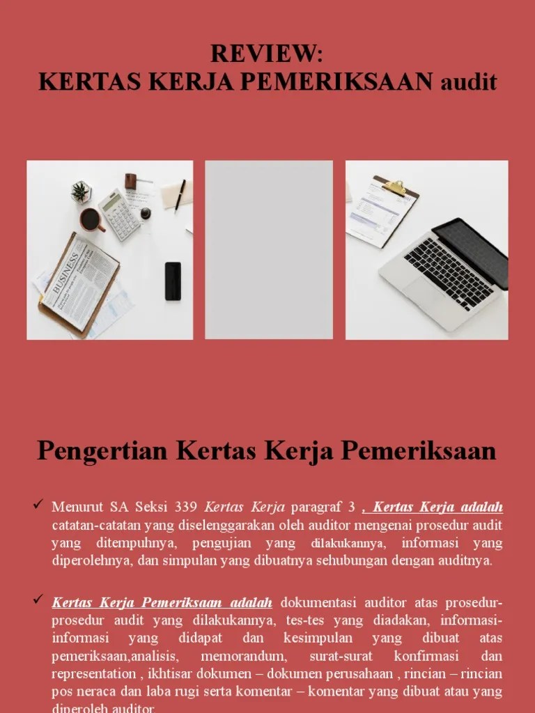 Apa itu kertas kerja audit? · hasil pemahaman terhadap struktur atau susunan pengendalian intern, · program audit, · analisis, · surat confirms, . Kertas kerja pemeriksaan (audit working papers) tujuan : Pengertian kertas kerja pemeriksaan dalam menjalankan pemeriksaannya (general audit), Pemeriksaan dalam bentuk kertas kerja pemeriksaan.