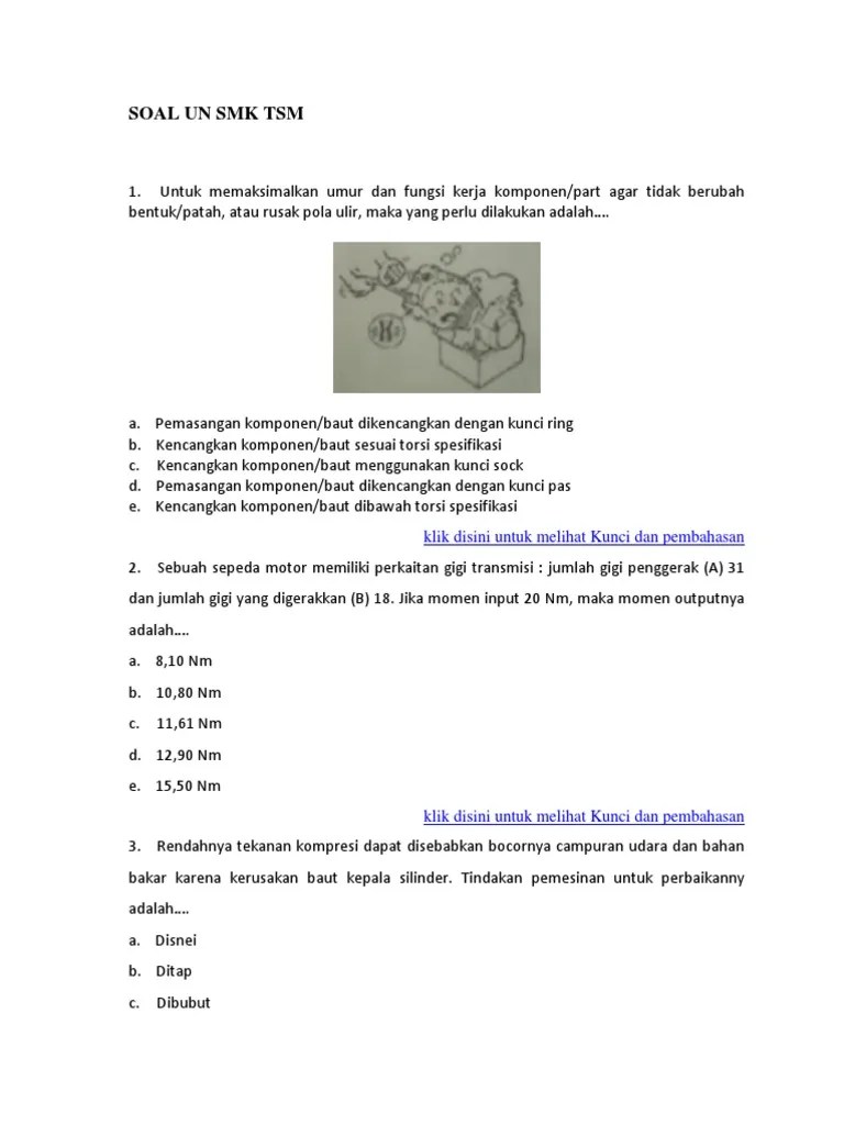 Soal Dan Jawaban Usbn Tsm Sepeda Motor - Soal Prediksi Ukk Produktif Tsm Smk Mak Cara Sunda / Z 1 60 dan z 2 30 b.. Latihan soal dan kunci jawaban usbn tkj 2020 dasar program . Kami membahas secara lengkap dengan kunci jawaban latihan soal un teori kejuruan teknik sepeda motor beserta jawabannya. Soal ujian teori kejuruan smk teknik sepeda motor (tsm) tahun 2018. Soal pilihan ganda dan esay untuk kejuruan teknik sepeda motor smk D) jawaban a, b, c adalah benar.